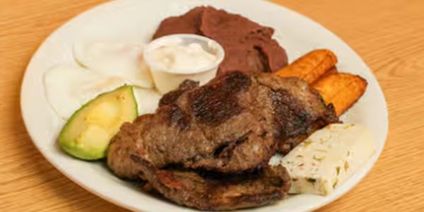 Frijoles, Queso, Crema, Huevo frito, salchicha, Platano maduro, Carne. Beans, Cheese, Cream, Fried egg, sausage, Ripe plantain, Meat.